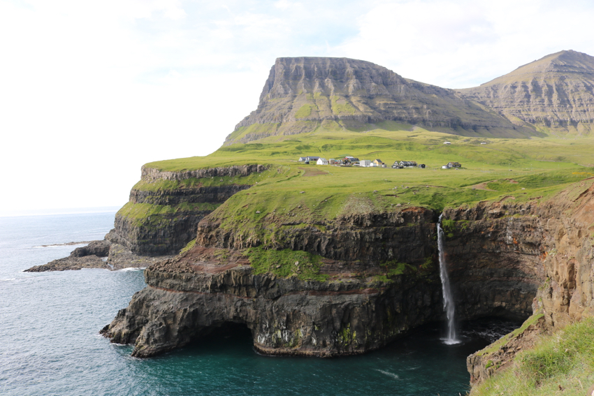 Der er fantastisk smukt der med den grønne dal, den lille by omgivet af fjeldene, den stejle klippevæg ned til havet og den ikke mindst vandfaldet. Og så er udsigten fra byen lige så storslået.